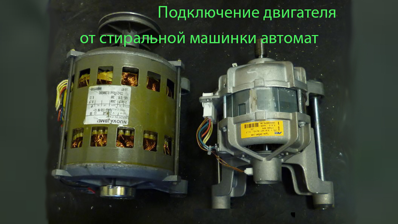 Электродвигатель от стиральной машины Вятка автомат, предназначенный для работы в однофазной сети. Состоит из двух рабочих и двух оборотных катушек. Вместе с конденсаторами они создают направление вращения вала.