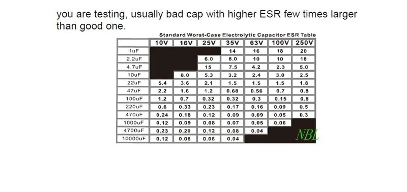 Таблица 1. Максимально допустимые значения ESR Ом для новых электролитических конденсаторов в зависимости от их номинала и допустимого напряжения.