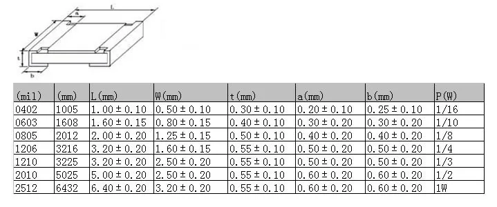 Корпусные исполнения: наиболее распространенными типоразмерами smd-резисторов являются 0201, 0402, 0603, 0805 и 1206. Цифры обозначают габаритные размеры в дюймовой системе, например, корпус 0402 имеет габариты 0,04х0,02″, размеры корпуса 0603 составляют 0,06х0,03″ и так далее.