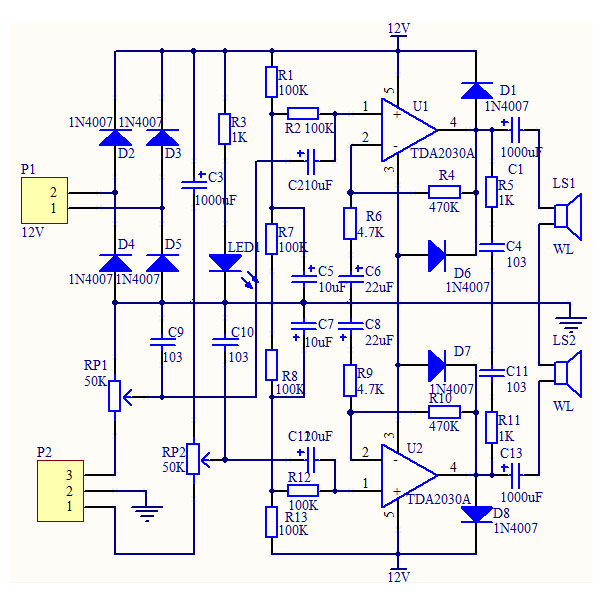 Цепь выпрямительного диода D, С11 для фильтрующего конденсатора, С12, С13 для высокочастотных развязывающих конденсаторов; RP для потенциометра регулировки громкости; IC1, IC2 — двухканальный усилитель IC; R1, R2, R3, C1 (R7, R8, R9, C6) для входа IC усилителя схемы смещения, так как схема представляет собой один источник питания, усилитель мощности IC, когда входное напряжение постоянного тока составляет половину цепи напряжения питания, чтобы работать правильно; R4, R5, C3 (R10, R11, C8) образуют петлю отрицательной обратной связи, изменение R4 (R10) может изменить размер коэффициентов обратной связи. C2 (C7) — входной конденсатор связи, C4 (C9) — выходной конденсатор связи; при подключении цепи к динамику с индуктивной нагрузкой R6, C5 (R12, C10) обеспечивает стабильность высокой частоты.