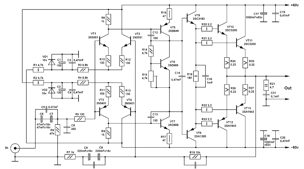 Высококачественный усилитель мощности на 11 транзисторах (100 Вт)