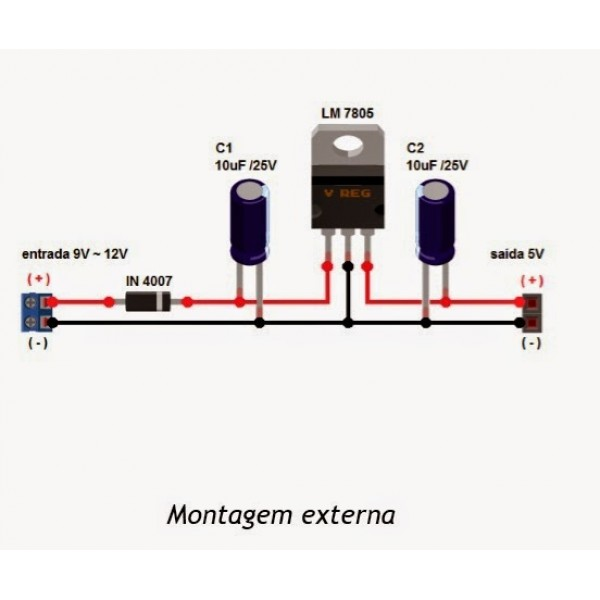 7805 как регулятор напряжения +5 ВРегулятор напряжения 7805 может регулировать входящее напряжение и выдавать его на +5В. Он работает с двумя конденсаторами на концах цепи 7805-регулятора.